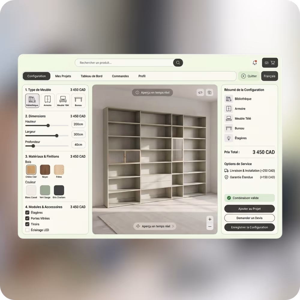 Appuyé par un outil de gestion des produits, des configurations possibles et des prix; le configurateur de produits permet aux clients ou aux représentants internes de l’entreprise de créer ou de personnaliser des produits complexes selon des besoins spécifiques. Il s'appuie sur une interface offrant une expérience utilisateur intuitive qui minimise les besoins de formation.