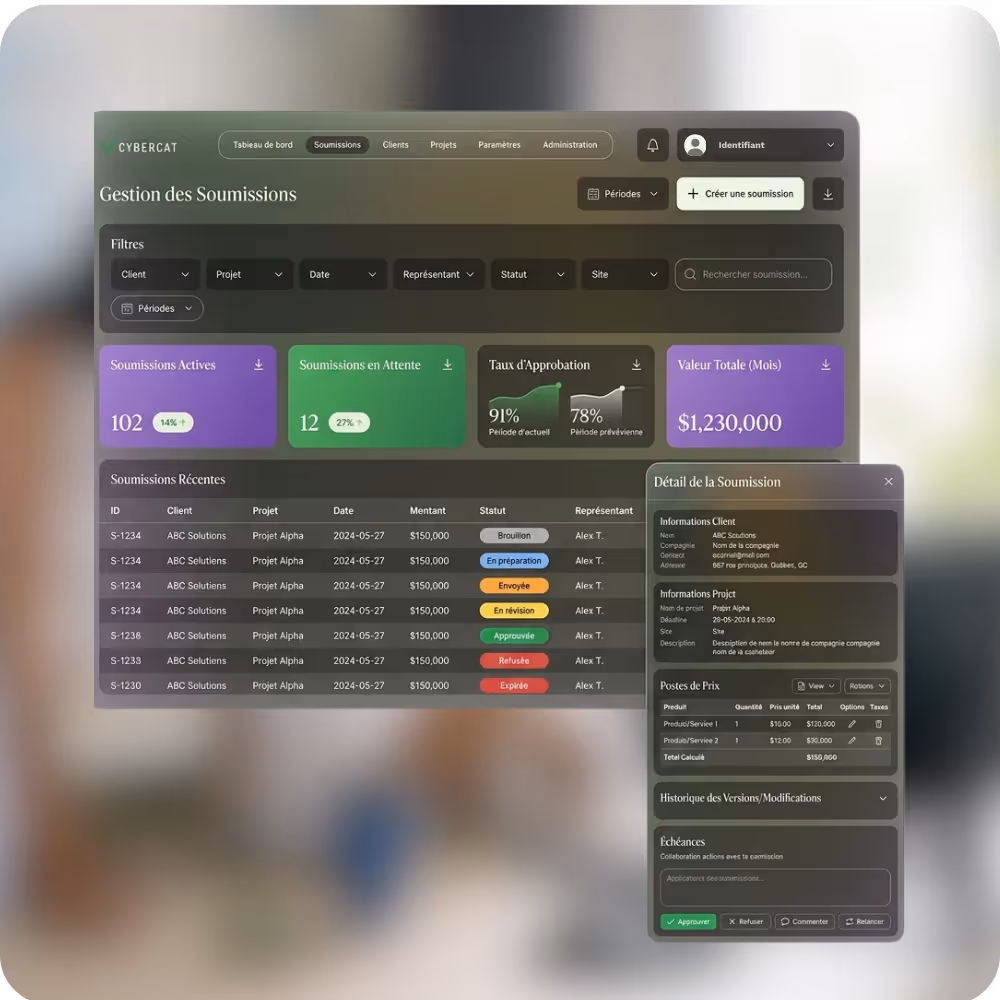 Cette application permet de faire la gestion et le suivi des soumissions et automatise le processus pour une efficacité accrue. Elle assure également la sécurité de l’information en gérant les accès pour les clients et les employés.
